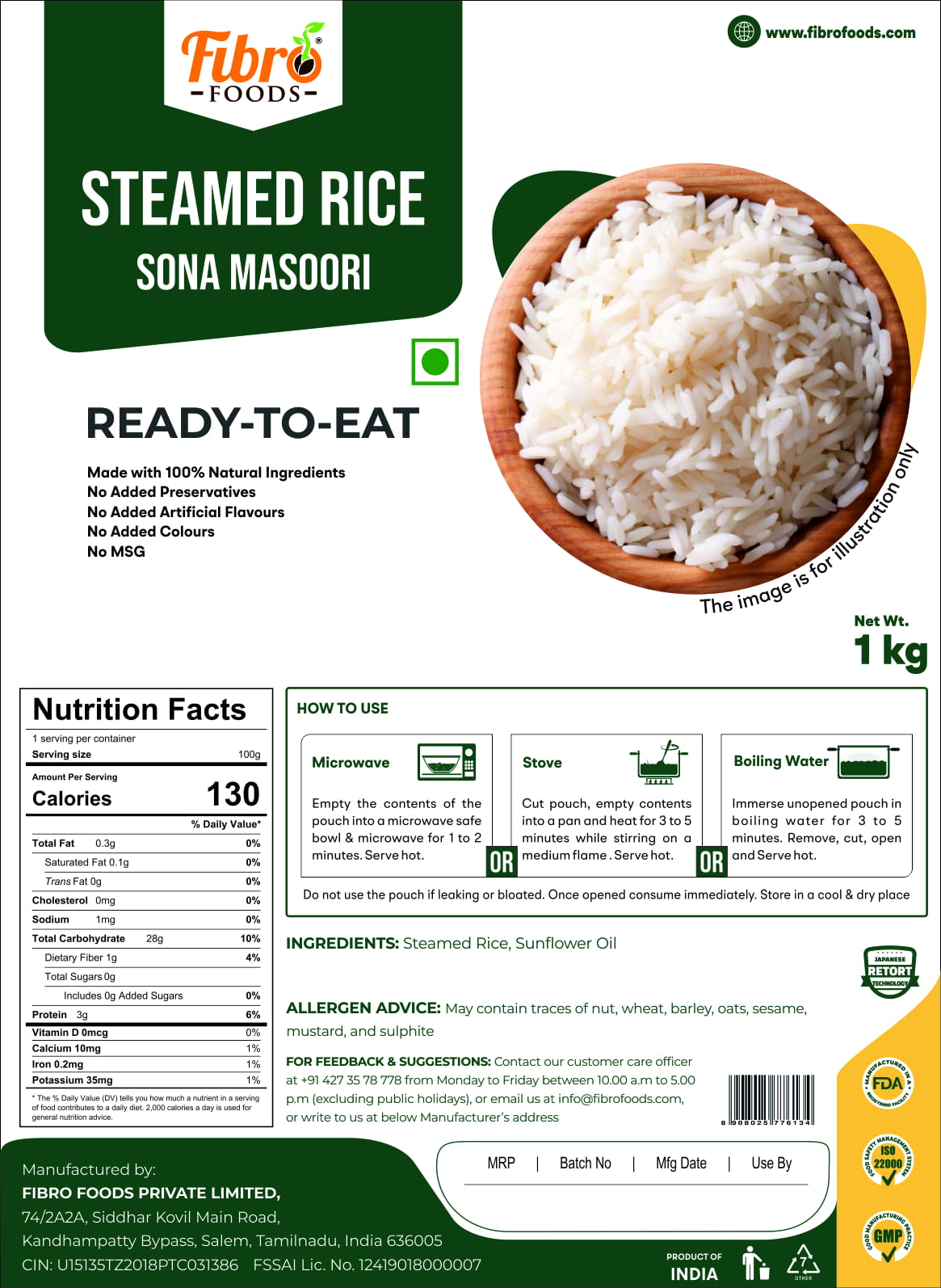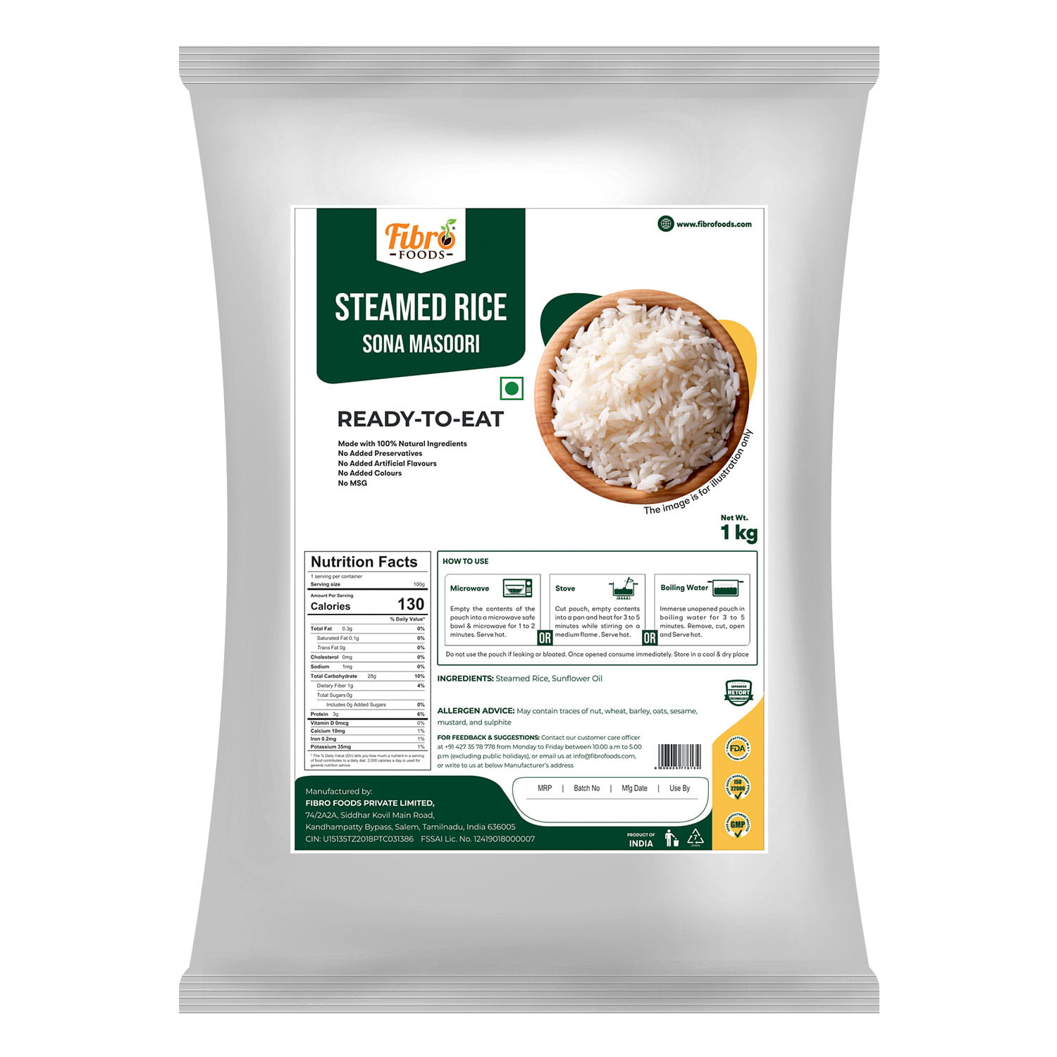 Experience the true taste of authenticity with our Ready-To-Eat Pre-Cooked Sona Masoori Rice. Our rice is freshly steamed to perfection, providing a quick and delightful dining experience. Fibro Foods proudly presents our Ready-To-Eat Pre-Cooked Sona Masoori Rice, crafted from premium quality ingredients. This convenient option offers clean, fresh, tasty, and traditional meals in just 5 minutes. Our Ready-To-Eat Pre-Cooked Sona Masoori Rice can be enjoyed straight from the pack or easily warmed up.